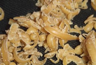 La cire est présentée ici en coupeaux dans des sachets de 100 g refermables. Elle vient de la Casamance et sens bon le miel encore.