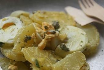 Ingrédients pour 4 personnes : 6 pommes de terre de taille moyenne, 4 oeufs, 2 c. à soupe de câpres, 1 c. à café bombée de persil haché, sel fumé. Pour la mayonnaise : 1 jaune d'oeuf extra frais, 10cl d'huile de tournesol, 1 c. à café de moutarde, sel, poivre.