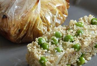 This recipe was prepared by my fiancé’s mother and once I saw it and tasted it, I wanted to share it with you!! I am a big salmon fan and I really adored this recipe because it’s completely different than what I usually do. The blend of the spices and the onions really enhanced the taste of the fish. The quinoa and green peas as a side dish, to change from rice, was a really good idea! I have to do it again!! Ingredients (for 4 persons): -4 slices of salmon -9 oz. of quinoa -3,5 oz of green peas -2 onions -2 tablespoons of cream -1 tablespoon of honey -1 teaspoon of ground ginger -1 teaspoon of curry -butter -salt, pepper Preheat the oven at 425°F. Bring water to a boil in a saucepan with a pinch of salt. Mince the onions than golden them in a pan with a little bit of oil until they start to caramelize. Put them in a bowl and add the cream, the honey, the ginger and the curry. Season with salt and pepper. Mix well. Put in 4 papillotes the salmon and share the onion preparation. Close the papillotes and put them in a dish or a drip pan and cook them for 20 minutes. Meanwhile, rinse the quinoa in cold water and cook it in the boiling water for 10 minutes then add the green peas and keep cooking for 10 more minutes. Drain it and add a little bit of butter. Serve immediately with the salmon.