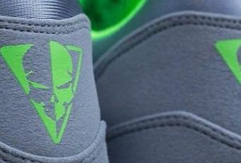 La paire a un upper en daim et mesh gris contrastés par des touches de vert fluo, un swoosh en cuir blanc et une semelle intermédiaire blanche. Elle vient de sortir chez les suisses de titolo.