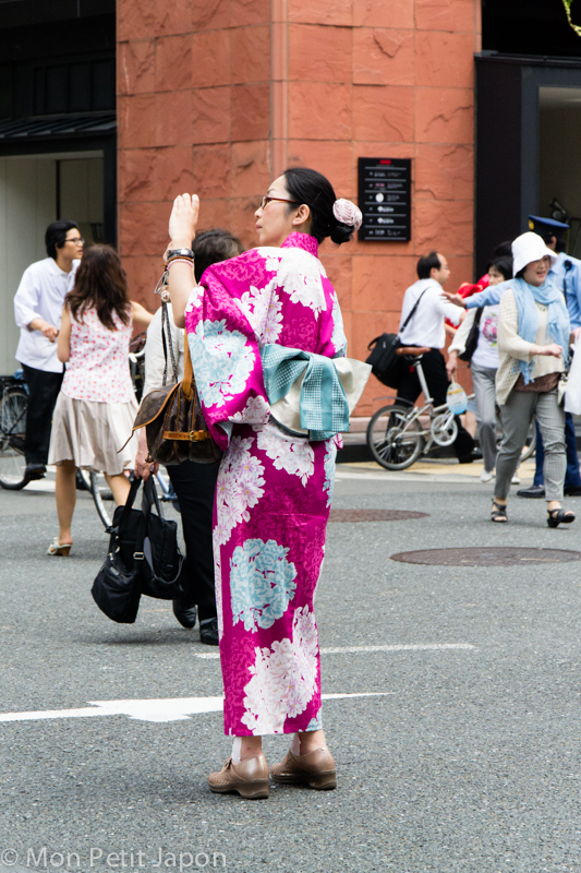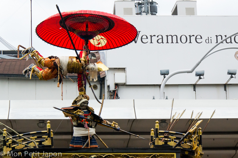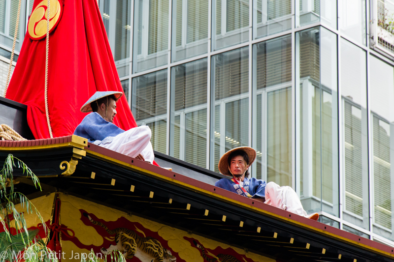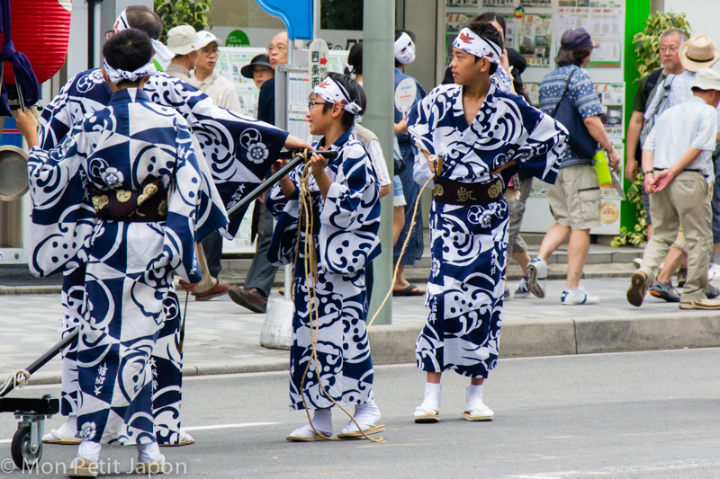 Je suis allée admirer les chars du défilé du Gion Masuri. Une trentaine de grands et petits chars parcours les avenues du quartier traditionnel. Les grands chars ne sont pas faciles à manœuvrer. Pour les faire tourner, il est nécessaire de les faire glisser à l'aide de bambous mouillés avec la force des bras. C'est impressionnant.
