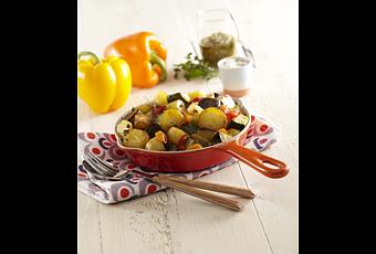 Ingrédients : 800 g de pommes de terre Ratte du Touquet • 1 courgette • 1 aubergine • 1 poivron jaune • 1 poivron rouge • 50 g de graines de courge dorées • 2 cuillerées à soupe de pesto • 1 cuillerée à soupe d’huile d’olive