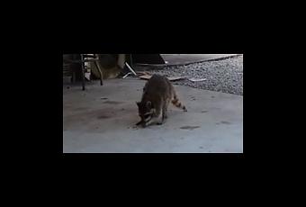 Des chats complètements surpris par l’arrivée furtive d’un raton laveur qui a bien envie de ce joindre à eux pour manger quelques croquettes. 1, 2, 3 …. une poignet de croquettes et le raton laveur part aussi vite qu’il est arrivé.