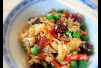 Ajouter les demi-lunes d'oignon, les bâtonnets de carottes, les petits pois et les dés d'ananas. Faire sauter pendant 3 minutes.