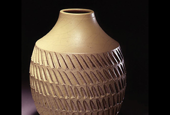 IMPORTANT VASE en céramique à couvercle beige scarifié d’incisions.