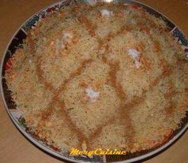 Rendement : 6 à 8 portionsPréparation : 25 mnCuisson : 45 mnIngrédients1 poulet d’environ 1,5 k 500 g de vermicelles : cheveux d’ange2 gros oignons émincés3 c à s d’huile d’olive½ c à c de gingembre moulu½ c à c de Ras El Hannut½ c à c de curcuma moulue½ c à c de poivre blanc mouluQuelques pistils de safran1 citronEau bouillante30 g de beurreSel et poivre