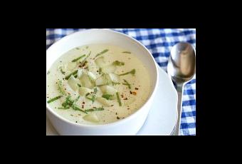 Servir très frais parsemé de morceaux de concombre et de menthe.