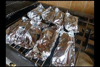 Découper autant de grands carrés de feuille d'aluminium que de pommes de terre. On peut aussi mettre deux pommes de terre dans la même papillote quand elles sont petites.