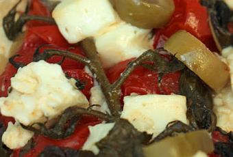 pour 4 personnes: 4 grappes de tomates cocktail 120 gr de féta 2 cuil à soupe d'olives vertes 4 cuil à café d'huile d'olive du basilic