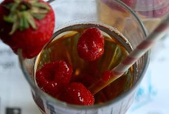 Un thé noir parfumé avec du miel, de la lavande, des bleuets, de la fraise et de la rhubarbe (Montagne Bleue de "Le Palais des Thés"), agréementé de fines tranches de citron vert et de quelques framboises surgelées, pour rafraîchir le tout...