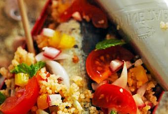 Taboulé de sardines en boîteIngrédients : 1 boîte de sardines à l'huile d'olive - 75g de coucous fin – du jus de tomate – ½ citron vert – 1radis taillé en tout petits cubes – 1 oignon nouveau en fin quartier – 1càs de poivron jaune taillé en tout petits cubes – 2 ou 3 petites tomates cerise en fin quartiers – ¼ de piment oiseau émincé très très fin – 1 dizaine de petites feuilles de menthe - de l'huile d'olive – sel et poivre Commencez en préparant le couscous. Versez-le dans une petite assiette creuse avec le jus de citron vert et mélangez. Versez également 2càs de jus de tomate et mélangez de nouveau. Laissez reposer le temps que les liquides soient absorbés. Egrenez, et rajoutez 1càs de jus de tomate. Laissez reposer et continuez à ajouter du jus de tomate jusqu'à ce que la graine soit suffisamment imbibée à votre goût. Moi je l'aime encore un peu ferme.Prenez ensuite deux sardines, prélevez-en une moitié. Ecrasez le reste très grossièrement. Ajoutez le radis, l'oignon, le poivron, la tomate, le piment et la menthe (gardez un peu de chacun de ces éléments pour décorer à la fin), salez, poivrez et mélangez très rapidement. Ajoutez assez de graines pour remplir à peu près une boîte et mélangez à peine.Versez dans la boîte le mélange, posez dessus la demi-sardine restante et la garniture que vous avez laissé de côté. Un filet d'huile et… Ah ouh Ah ouh chachacha ! direction la plage !Et je vous rappelle que nous avons rendez-vous sur l'herbe de Bercy le 4 août si le cœur vous en dit pour pique-niquer tous ensemble pour le der des ders de mes pique-niques !Si vous voulez savoir le où, le quand, le quoi et le comment et quelques autres petites choses cliquez sur la bannière juste en dessous !
