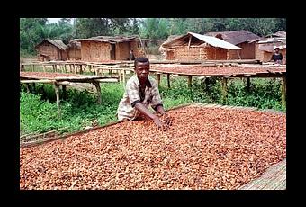 un jeune paysan sèche des fèves de cacao, le 02 février 2000 dans le village de Mankranso dans la région de Kumasi au Ghana. Le Ghana, 2e producteur mondial de cacao après la Côte d'Ivoire, est victime de la baisse des cours sur le marché mondial. © ISSOUF SANOGO / AFP