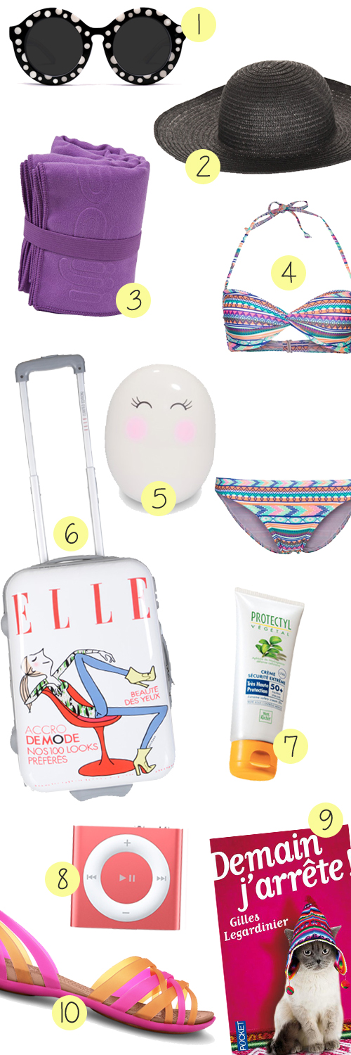 1. Des lunettes originales et hypra-féminines (L'Usine à Lunettes) : 13€992. Une capeline pour éviter les insolations (Pieces sur Unclejeans.com) : 16€953. Une serviette en micro-fibre pour être sèche en quelques secondes (Nabaiji) : 7€954. Un maillot ultra-coloré pour bronzer toute la journée (Billabong sur Zalando.fr) : 55 €5. Un chargeur d'urgence, pour pouvoir partager ses photos toute la journée (Xoopar) : 34€996. Une valise, pour emmener sa garde-robe complète avec soi (Elle sur Bagages.fr) : 119 €7. De la crème solaire pour protéger sa peau du soleil et bronzer en toute sérénité (Yves Rocher) : 22€508. Un lecteur MP3, pour écouter de la musique pendant le trajet vers sa destination estivale (Apple) : 55 €9. Un livre trop canon pour bouquiner sur la plage ou au bord de la piscine (Fnac.com) : 7€6010. Des chaussures légères et colorées pour avoir le confort aux pieds (Crocs) : 49€99