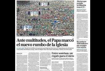 Si au chiffre de pèlerins sur la plage de Copacabana hier matin très élevé et qui fait donc l'événement à lui tout seul (plus de 3 millions - le Pape lui-même dit avoir du mal à y croire malgré ce que ses yeux ont vu du haut de l'autel), vous ajoutez l'invitation adressée par Dilma Roussef à ses homologues de la région, laquelle s'est vu acceptée entre autre par la Présidente argentine (ainsi que par Evo Morales et le Président du Surinam, minuscule pays du nord du sous-continent, ainsi que par le vice-président uruguayen, venu en représentation de Pepe Mujica, un peu converti mais encore très circonspect), on ne s'étonnera pas que ce matin les quotidiens nationaux à Buenos Aires abondent et rivalisent en articles divers et variés, reportages, analyses, éditoriaux et même caricatures...