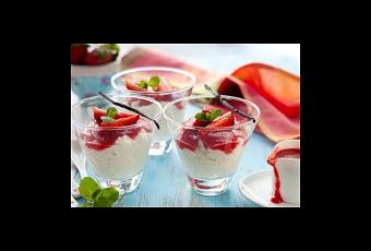 Servir le riz au lait en verrine, napper de coulis de fruits et décorer d'une fraise, la verrine doit être bien fraiche.