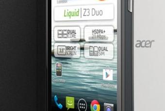 Après le Liquid Z2 en début d’année, Acer vient d’annoncer son nouveau smartphone d’entrée de gamme avec un double port SIM, le Liquid Z3 Duo qui vous propose un écran de 3,5″ avec une résolution de 320×480, un processeur dual-core cadencé à 1 GHz, 4Go de mémoire interne, 512Mo de RAM, un APN de 3 Mégapixels, l’A-GPS, la 3G/3G+, le WiFi et pas de Bluetooth, un accéléromètre, une autonomie annoncée de 6h en conversation et jusqu’à 450h en veille, l’accès à l’Acer Cloud, le tout dans 109x60x10,4mm pour 120g.