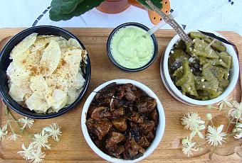 Aujourd'hui je vous propose un apéritif léger et frais pour l'été : carrés de poivrons marinés à l'ail, champignons à la grecque, chips épicées maison sans graisse et dip de courgette. Mise à part le dip de courgette à préparer au dernier moment, l'idéal est de le préparer la veille.