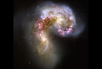 Très belle photo de l’ensemble appelé « Galaxies des Antennes », formé des galaxies NGC 4038 et NGC 4039 enroulées l’une autour de l’autre ! Quelques années après une première publication impressionnante, le Télescope Spatial Hubble nous donne à voir avec une acuité irrésistible et extraordinaire la collision de ces deux galaxies qui a probablement commencée entre 500 et 100 millions d’années ! Rappelons que les deux tâches jaunes sont les coeurs denses des deux galaxies. Ils sont réunissent principalement les étoiles les plus âgées. Les écharpes rouges, blanches et bleues sont composées d’étoiles jeunes ou en formation. La « Galaxie des Antennes » se situe à environ 60 millions d’années-lumière de la Terre, en direction de la constellation Corvus, visible dans l’hémisphère sud.