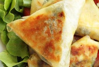 Couper la feuille de brick en 2, plier la partie ronde vers l’intérieur puis plier les samoussas (voir ici)