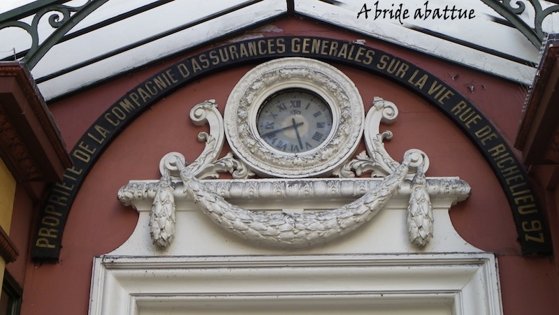 Les horloges témoignent de la proximité des relais des diligences. Il était crucial d'y lire l'heure.Nous verrons d'autres horloges dans chaque passage. Au bout de celui-ci nous voici de nouveau sur le boulevard, histoire de pointer l'immeuble qui projette ses balcons sur le carrefour, et où il était de bon ton de se montrer. La toiture est en forme de pignon de pin nous dit notre guide, d'où l'expression "avoir pignon sur rue".