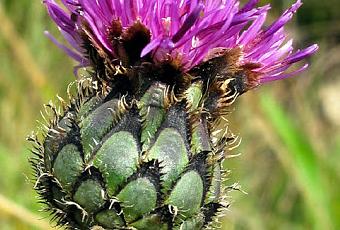 La Centaurée scabieuse (Centaurea scabiosa) est commune sur les pelouses, dans les prairies maigres, les lisières, aux bords des chemins…Elle se reconnait aisément à ses feuilles découpées en nombreux segments étroits et aux bractées de ses capitules, vertes et prolongées, sans étranglement, par un appendice triangulaire noirâtre, cilié. Réceptacle floral, entouré des bractées, persistant après la floraison