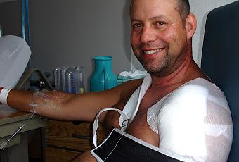 Mon pauvre petit mari et homme adoré s'est fracturé, lire plutôt cassé mal sale le bras (os majeur, l'humérus) en tombant du haut d'une échelle sur notre garage. Ouais...vraiment pas drôle tout ça. En plus, j'l'ai vu tomber...!!!! Ahhhh...misère...!!!! Les ambulanciers avaient peine à savoir qui d'entre nous deux était le "patient" tellement j'étais en panique. Le pire, j'exagère à peine...hi hi !!!