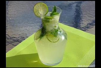 Pressez le jus de cinq citrons verts. Ajoutez la moitié des feuilles de menthe ciselées et l'autre moitié des feuilles de menthe entières. Ajoutez l'eau minérale gazeuse. Mélangez.