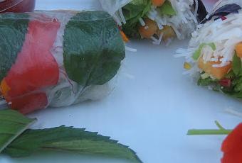 24 grandes feuilles de menthe poivrée, fraîches ou autre herbe fraîche, au goût Pétales de fleurs comestibles, en quantité suffisante (bégonias, calendulas, roses, hémérocalles, capucines...) 24 feuilles de laitue fine comme la Boston, roulée puis coupée en lanières ou entière 3 à 4 carottes pelées et coupées en juliennes 1/2 concombre anglais, coupé en juliennes 1 poignée de pousses germées de mange-tout, tatsoï ou fèves germées, au choix ¼ de paquet de vermicelles de riz