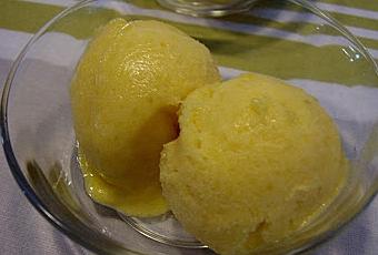 Pour 1 bac de glace : 2 mangues bien mûres, 80g de sucre, le jus d"un citron, le jus d'une orange, 1 blanc d’œuf- Mélanger le sucre avec le jus de citron et le jus d'une orange.
