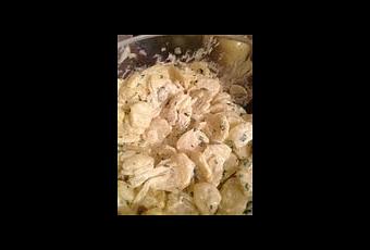 Mmmmh la salade de pommes de terre à l'allemande .... Tout ceci me rappelle mon séjour Erasmus en Allemagne ... Pour l'été, c'est un choix de salade tout à fait approprié qui se marie parfaitement avec un rosbeef par exemple ou des saucisses, merguez, brochettes et tutti quanti ... Pour tout vous dire, j'adore la salade de pommes de terre mais j'en ai toujours mangée au Biergarten (brasserie en plein air) ou chez des amis allemands. Je me suis donc lancée dans sa confection ... Je vous rassure, rien de terrible ... il faut juste du temps.Pour 6 personnes, vous aurez donc besoin de :2 kg de pommes de terre175 g d'oignons émincésquelques cornichons aigres doux débités en petites tranches1/2 L de bouillon de légumesde la moutarde (ou si vous avez de la moutarde allemande dite Senf : moutarde plus sucrée, idéale pour la Kartoffelsalat. A la place, on peut rajouter un peu de sucre en poudre)de la mayonnaise (la recette dit 250g mais je trouve ça énorme ... du coup, j'ai choisi de mélanger à la mayo du fromage blanc ...)de la ciboulette un peu d'huile (j'ai choisi de l'huile de colza)un peu de vinaigre (j'ai choisi du vinaigre de cidre)Commencez par faire cuire les pommes de terre. Laissez les reposer une fois cuites.Une fois qu'elles sont tièdes, épluchez les et détaillez les en rondelles.Coupez en petits morceaux les oignons. Mélangez oignons et pommes de terre. Ajoutez les cornichons. Bien mélanger le tout, ajoutez une cuillère à soupe d'huile.Préparez un bouillon de légumes. Y ajouter de la moutarde, un peu de sucre (si on a pas de vraie moutarde allemande "Senf" donc), un peu de vinaigre. Mélangez et laissez refroidir le bouillon.Ajoutez le bouillon au mélange de pommes de terre. Réservez au frais.Au moment de servir, rajoutez la mayo (ou mayo/fromage blanc), mélangez bien, rectifiez au besoin l'assaisonnement et ajoutez un peu de ciboulette ou de persil !Guten Appetit !
