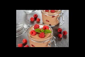Dans des verrines, mettre une couche de mousse, parsemer de framboises, recommencer jusqu'en haut.