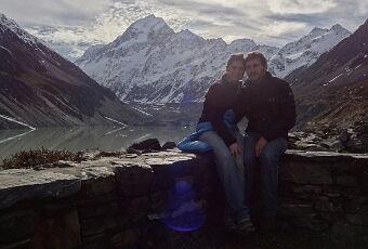 Pour l’anniversaire de Nico, une petite photo en amoureux au pied du glacier Hooker. Derrière nous le lac d’arrivée et la rivière de glace au fond