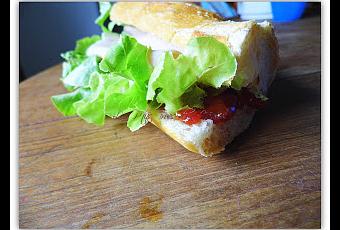 - un morceau de baguette d'environ 20-25 cm- 1 tranche de blanc de poulet (ou dinde)- du confit de tomate et thym (Quai Sud)- de la salade (moi j'en mets plein!)- du fromage à tartiner type ChavrouOuvrez votre baguette.Sur une face, étalez un peu de confit de tomate et thym.Recouvrez avec de la salade.Ajoutez la tranche de blanc de volaille et finissez en tartinant le fromage sur la dernière face.