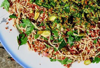 24 heures à l'avance, faire tremper le quinoa dans trois fois son volume d'eau froide. Renouveler l'eau de temps en temps, au moins une fois. Egoutter le quinoa et le faire cuire dans une casserole d'eau bouillante pendant 5 à 10 minutes. On peut ajouter des zestes de citron dans l'eau de cuisson. Alternativement à la cuisson, il est possible de faire germer le quinoa durant 24 à 48 heures, dans un germoir placé à l'ombre (voire à l'obscurité) dans une pièce assez chaude. Peler la boule de céleri et la râper finement. Presser les citrons, laver puis hacher les feuilles de persil plat. Dans un grand saladier, mélanger le quinoa, le céleri râpé, le jus de citron et le persil effeuillé. Verser la purée de pistaches et mélanger longuement à la main afin de bien répartir la purée de pistaches. La gremolata céleri-pistache-citron