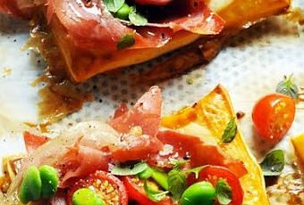 Croustillants d'AosteIngrédients : 6 tranches de jambon d'Aoste fines et fondantes – 1 rouleau de pâte feuilletée – 1 jaune d'œuf – 6 petits cœurs d'artichauts au naturel – 75g de feta – 1 poignée de fèves écossées – 12 tomates cerise – 1 douzaine de feuilles de menthe - sel et poivre – huile d'olive – du miel liquide Etalez la pâte feuilletée, coupez-y 4 carrés et posez-les sur une plaque couverte de papier sulfurisé.Avec un pinceau trempé dans le jaune d'oeuf badigeonnez le pourtour des carrés de pâte sur deux centimètres.Emiettez la feta au centre de la pâte et posez dessus les petits cœurs d'artichauts coupés en deux et bien égouttés. Enfournez dans un four préchauffé à 180° pendant 5 minutes, il faut que les croustillants soient bien dorés.Faites chauffer une casserole d'eau salé et faites-y cuire les fèves pendant 3 minutes.Sortez les croustillants du four et ajoutez dessus les tranches de jambon grossièrement déchirées en les chiffonnant, les tomates cerise coupées en deux et les fèves.Enfournez de nouveau toujours à 180° pour 3 minutes.Sortez du four, poivrez généreusement, parsemez les feuilles de menthe et terminez par un trait d'huile d'olive et un autre de miel juste avant de servir.