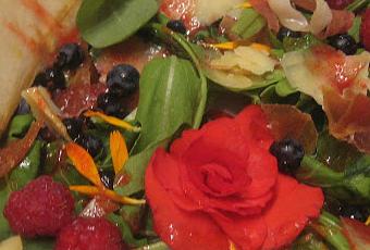 Déposer la roquette au fond des assiettes. Superposer joliment quelques bégonia, ajouter une moitié de poire tranchée placée en éventail sur le rebord de l'assiette, ainsi que les bâtonnets de Napoléon, groupés trois par trois. Ajouter les copeaux de fromage cheddar, les morceaux de prosciutto et les petits fruits sur la roquette. Saler et poivrer et verser un mince filet de vinaigrette ou sinon, présenter la vinaigrette dans une carafe et laisser chacun arroser sa salade. Servir avec un bon pain de grains grillé ou des croûtons.