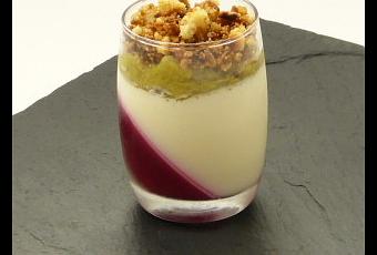 Panna cotta vanille, gelee de fruits rouges, compotee de rhubarbe et son croustillant crumble
