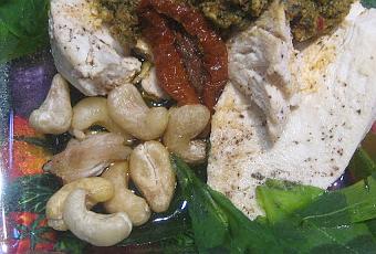 Coupez le poulet en languettes ou en aiguillettes et disposez en éventail sur une assiette de service ou des assiettes individuelles. Arroser légèrement d'un filet d'huile d'olive puis de pesto. Décorer d'herbes fraîches tout autour et d'olives noires, de tomates séchées ou de noix de cajou, au centre de l'assiette. Superposer un peu de roquette, si désiré.