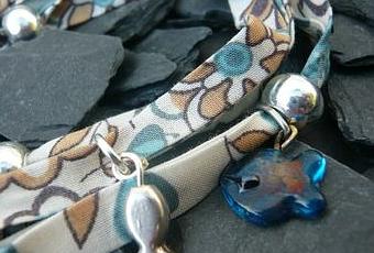 Pour le réaliser, j'ai pris environ 50 cm de biais de 0,5 cm de large environ, 5 grosses perles argent avec gros trou, une breloque poisson argentée et l'anneau pour l'accrocher, une breloque poisson bleu, deux attaches qui se referment sur les extrémités du biais, une courte chaîne (3 cm), qu'on accroche d'un côté du biais (et qui permet d'ajuster la longueur du bracelet) et un fermoir (que l'on fixe de l'autre côté).