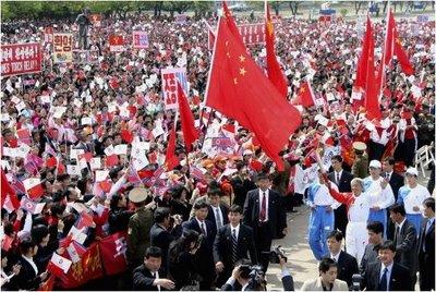 réception à la hauteur, enfin, de ce magnifique évènement. On peut faire confiance aux Nord-Coréens pour organiser un tel relais à Pyongyang dans le calme et l'ordre :