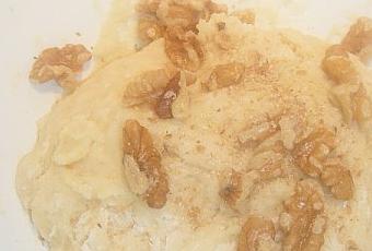 lait, oeufs, beurre, sucre, levure, noix et raisins secs, sel en dernier.