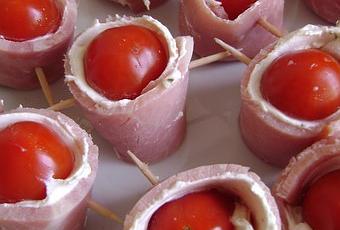 2) Tartiner des tranches de jambon d'un peu de fromage frais, poser une tomate cerise à l'extrémité et rouler.