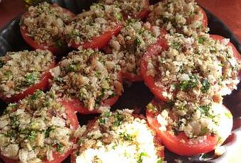 Pour la garniture, l'élément principal est la chapelure. J'utilise des croutes de pain rassis passées au mixer de façon pas trop fine. Mélanger cette poudre grossière avec un hachis d'ail (3 gousses pour 6 grosses tomates) et de persil (une grosse mail), quelques feuilles de basilic frais. Saler et poivrer, ajouter trois cuillerées à soupe d'huile d'olive.