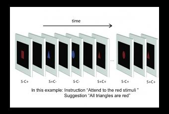· L’étude publiée dans PLoS ONE a été menée auprès de 2 participants facilement hypnotisables et « déshypnotisables ». Les chercheurs ont évalué l’activité cérébrale par EEG en réponse à une série de formes, carrés, triangles ou cercles, rouges ou bleues (Voir image ci-contre). Les participants ont été hypnotisés et par hypnose les chercheurs leur ont suggéré que certaines formes ont toujours la même couleur. Sous hypnose,