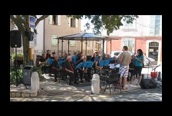 Rendez-vous à 11h30 sur la place de la mairie. Déjà il est difficile de trouver une place au bar "Chez Fanfan". Je trouve une place auprès de Valérie V , toujours aimable avec chacun. Nous discutons de ses fils , en vacances loin d'Ampus. A une table proche je vois Maryse et je lui demande des nouvelles de Josette. Bientôt elle sera à Figanières pour se remettre de sa chute.Et ainsi de suite , les conversations vont bon train jusqu'au début du concert donné par l'Harmonie aurélienne. Une heure de musique appréciée de tous.