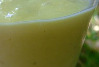INGRÉDIENTS• 200 g de mangue (fraîche ou surgelée) • 1 banane • 1 càs de miel • 1 yaourt bulgare (150g) • 100 ml de lait (un verre)