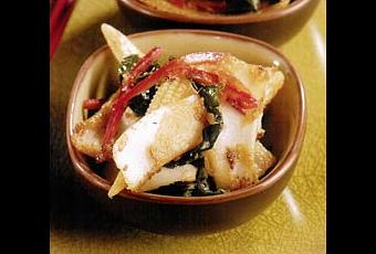 - Ajouter les épinards émincés, assaisonner et poursuivre la cuisson pendant 3 à 4 mn. Déglacer avec la sauce de soja et mélanger bien. Servir sur une salade de chou