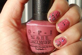J’ai utilisé le verni “Japanese Rose Garden” en base (deux couches), un magnifique rose bonbon très chic ; puis j’ai appliqué en guise de Top Coat le “Blizzard” de Models Own, un mélange de paillettes dans les tons argentés qui tournent au vert ou au jaune suivant la lumière.