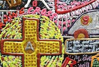 Tout est dans le détail, tout est en couleur, mots formes, symboles, c'est travaillé et parlant, gai, moderne et vivant. Des détails de deux des peintures de Manuel Gyo, pris ici et ici :