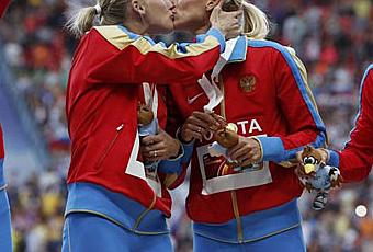 - Aux championnats du monde d’athlétisme de Moscou, deux coureuses russes, titrées sur le relai 4x400m, se sont embrassées sur la bouche lors de la remise des médailles. Une façon pour elles de protester contre la nouvelle loi de Poutine interdisant la propagande de l’homosexualité. Dans ta face mon Vlad’.